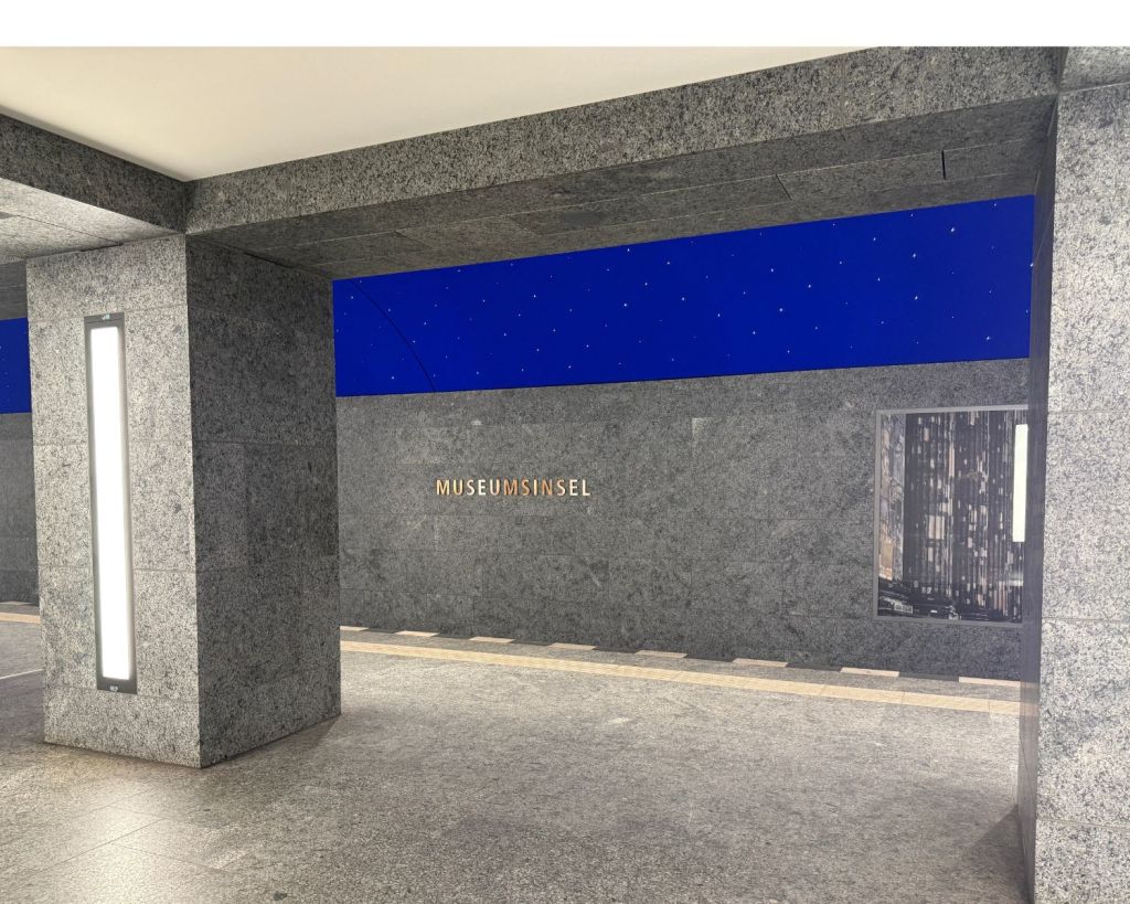 Der U-Bahnhof Museumsinsel liegt direkt unter der Spree, in unmittelbarer Nähe zu Berlins berühmten Kulturstätten wie dem Pergamonmuseum und dem Berliner Dom. Nach jahrelangen Bauarbeiten wurde der Bahnhof schließlich im Jahr 2021 eröffnet. Verantwortlich für das künstlerische Konzept ist der Architekt Max Dudler, der gemeinsam mit Lichtkünstler:innen ein spektakuläres Raumerlebnis schuf.