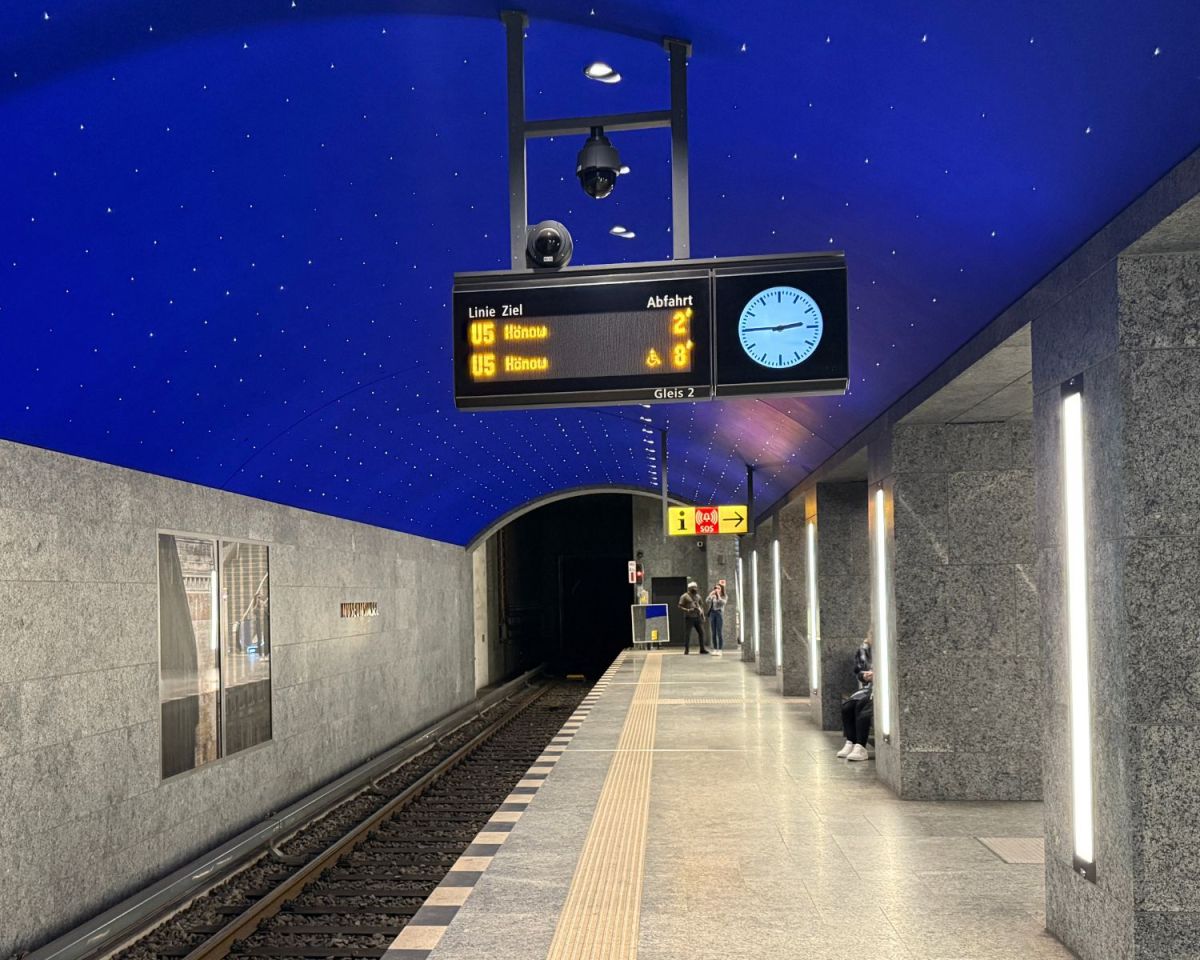 Schon beim Betreten des Bahnhofs fühlt man sich wie in eine andere Welt versetzt. Die insgesamt 6662 Lichtpunkte an der Decke des U-Bahnhofs sorgen dafür, dass das tiefblaue Gewölbe an einen nächtlichen Sternenhimmel erinnert. Dudler hat sich dabei von dem Berliner Baumeister Karl Friedrich Schinkel inspirieren lassen, der 1816 einen Nachthimmel als Bühnenbild für Aufführungen der Zauberflöte entworfen hatte.
